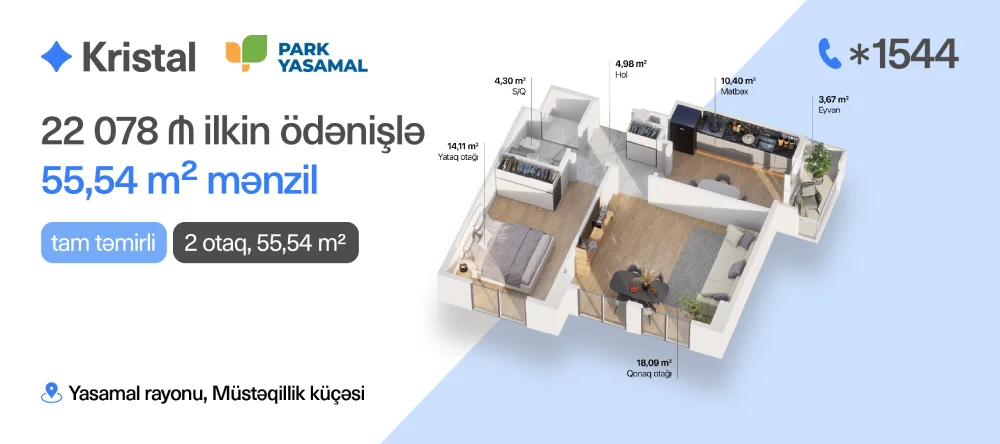 “Kristal”ın “Park Yasamal” layihəsində mənzil satışları 15%-dən başlayan ilkin ödənişlə davam edir.