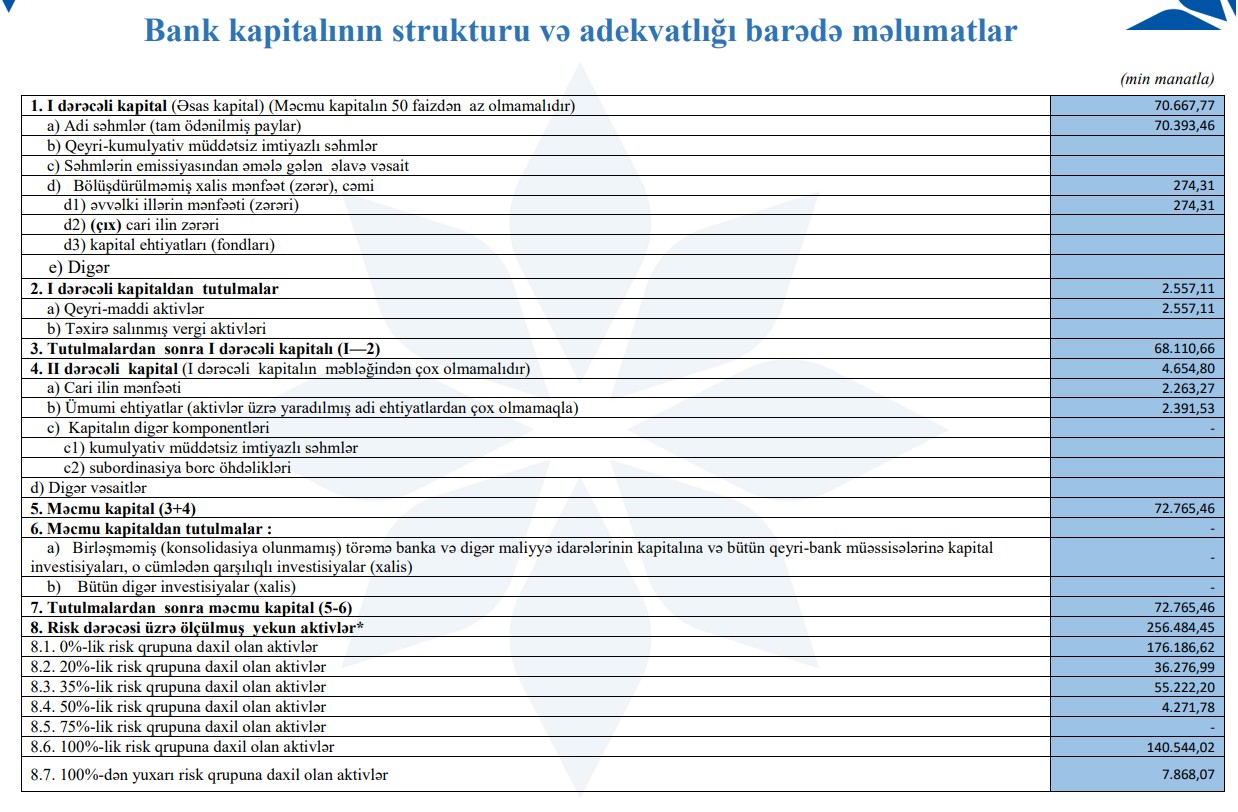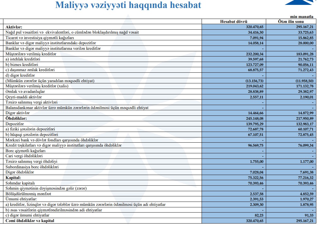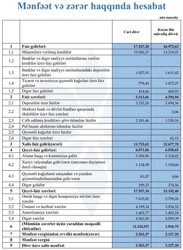 Qeyd edilib ki, cari ilin 9 ayı ərzində bankın cəmi aktivləri 10%-dək artaraq 320,4 milyon manata çatıb. Bankın mənfəəti isə əvvəlki dövrə nisbətən 6% artım göstərib. Kredit üzrə faiz gəlirləri 14% artmışdır.