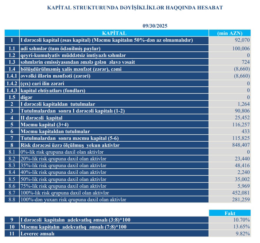 Mümkün zərərlər üçün yaradılan ehtiyatlara ayırmalar 2025-ci ilin doqquz ayında 19,7 milyon manat olub. Bu, ötən ilin eyni dövrü ilə müqayisədə 4,3 milyon manat və ya 28 artım deməkdir (2024 – 15,4 milyon manat).