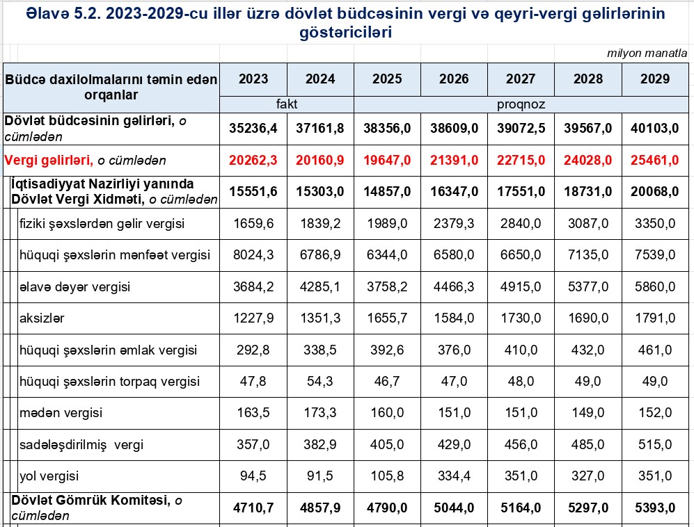 Vergi daxilolmaları proqnozları üzrə daha kəskin artım nəzərdə tutulub. 2023-cü ildə 20 milyard 262 milyon manat olan vergi gəlirləri 2029-cu ildə 25 milyard 461 milyon manata çatacaq. Bu, təxminən 5 milyard 199 milyon manat artım və təxminən 25.7% artımı göstərir — yəni büdcə gəlirlərindəki ümumi artımın əsas hissəsi vergi bazasının genişlənməsindən gəlir.