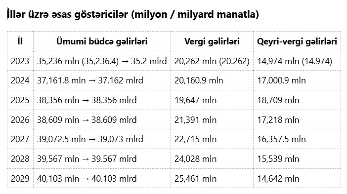 Marja.az rəsmi proqnozlara istinadən xəbər verir ki, 2023-cü ildə 35 milyard 236 milyon manat olan ümumi gəlirlər 2029-cu ilə qədər 40 milyard 103 milyon manata çatacaq — bu, təxminən 4 milyard 867 milyon manatlıq artım və təxminən 13.8% artım deməkdir.