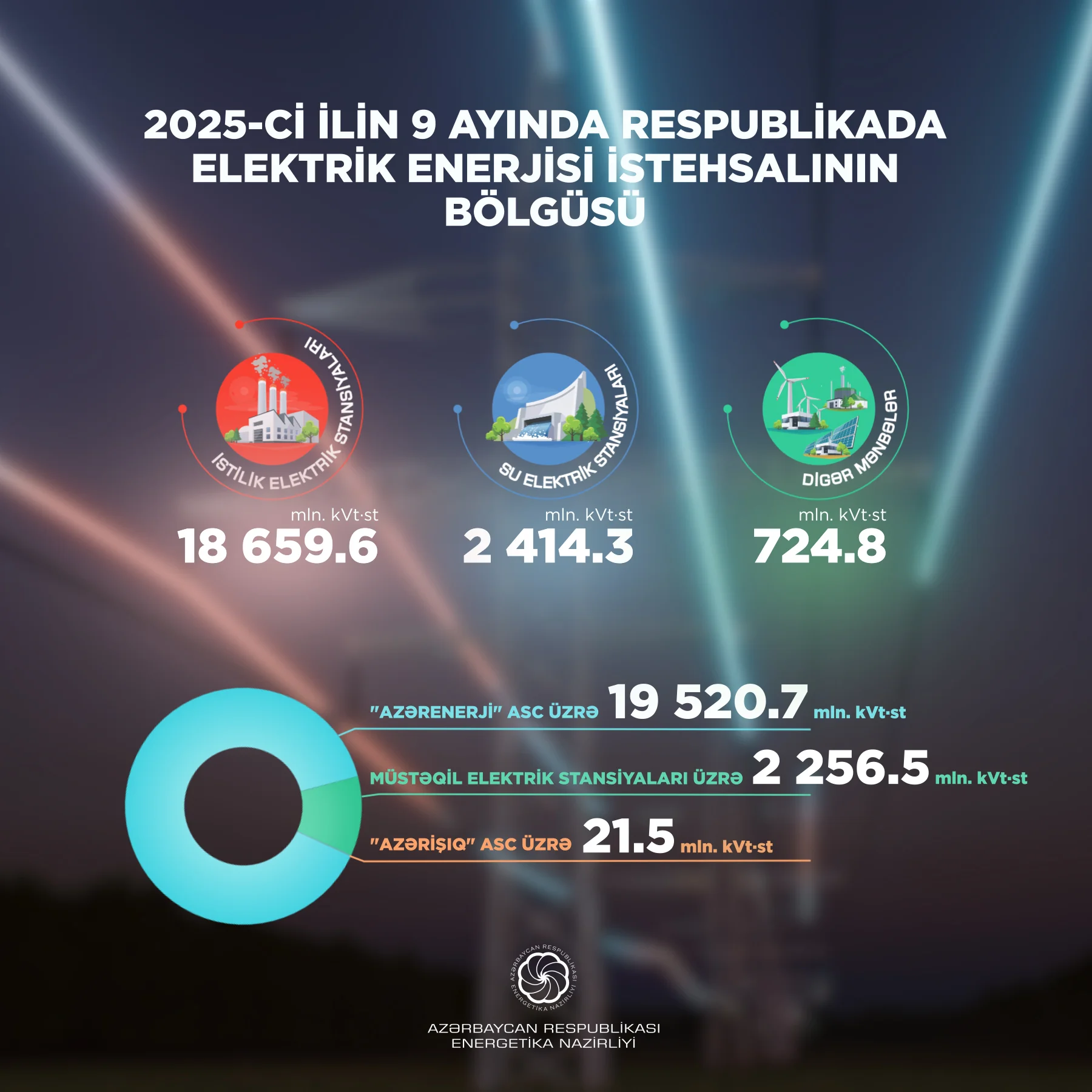 9 ay ərzində elektrik enerjisinin istehsalı “Azərenerji” ASC üzrə 19 520,7 mln. kVt·st (İES-lərdə 17 070,6 mln. kVt·st, SES-lərdə 2 401,1 mln. kVt·st, GES-lərdə 49,0 mln. kVt·st), “Azərişıq” ASC üzrə külək elektrik stansiyalarında 21,5 mln. kVt·st, müstəqil elektrik stansiyaları üzrə isə 2 256,5 mln. kVt·st təşkil edib.