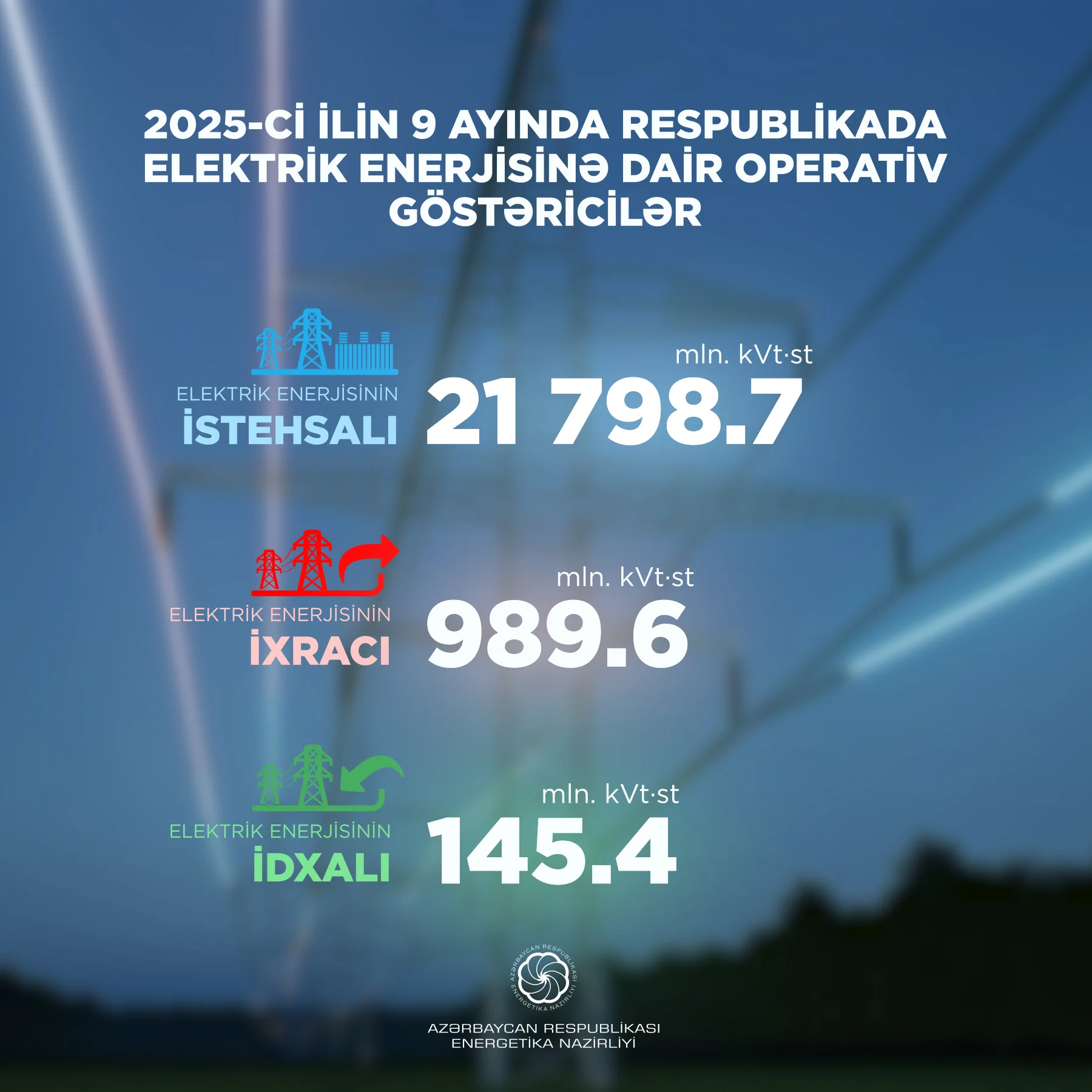 Hesabat dövründə elektrik enerjisinin idxalı 145,4 mln. kVt·st, ixracı isə 989,6 mln. kVt·st olub.