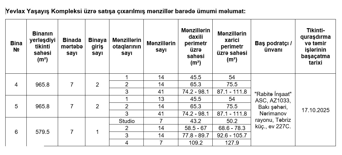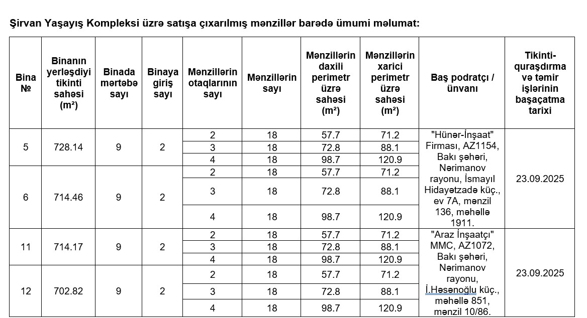 Satışa Hövsan Yaşayış Kompleksinin birinci mərhələsi üzrə 1, Hövsan Yaşayış Kompleksinin ikinci mərhələsi üzrə 7, Sumqayıt Yaşayış Kompleksi üzrə 10, Lənkəran Yaşayış Kompleksi üzrə 10, Binəqədi Yaşayış Kompleksi üzrə 204, Şirvan Yaşayış Kompleksi üzrə 216, Yevlax Yaşayış Kompleksi üzrə 179 mənzil olmaqla, ümumilikdə 627 mənzil çıxarılır. Bütün mənzillər tam təmirli, mətbəx mebeli, kombi isitmə sistemi (kombi cihazı daxil olmaqla), su, qaz və elektrik sayğacları ilə təmin edilmiş vəziyyətdə təklif olunur.
