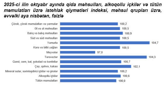 2025-ci ilin oktyabr ayında qida məhsulları, alkoqollu içkilər və tütün məmulatları üzrə istehlak qiymətləri indeksi əvvəlki aya nisbətən 0,8 faiz, yanvar-oktyabr aylarında isə əvvəlki ilin müvafiq dövrünə nisbətən 6,9 faiz artıb.