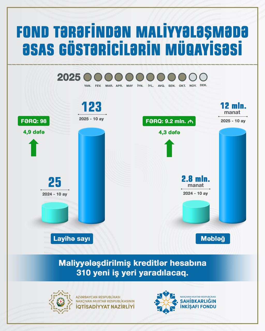 Naxçıvan Muxtar Respublikası Sahibkarlığın İnkişafı Fondu tərəfindən 2025-ci ilin yanvar–oktyabr ayları ərzində 123 layihənin maliyyələşdirilməsinə 12 milyon manat məbləğində güzəştli kredit vəsaiti ayrılıb.