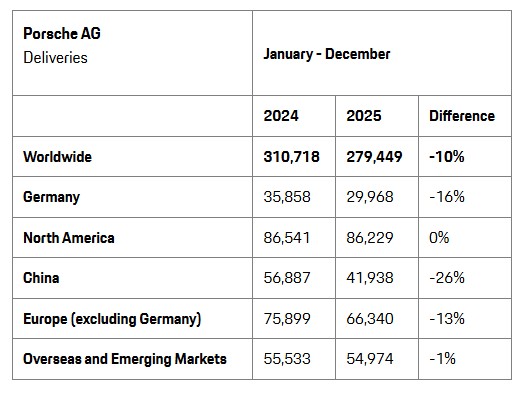 Volkswagen-in lüks markası olan Porsche 2025-ci ildə 279 min 449 avtomobil təhvil verib. Satışlardakı azalmaya əsasən Çin və Almaniya səbəb olub.