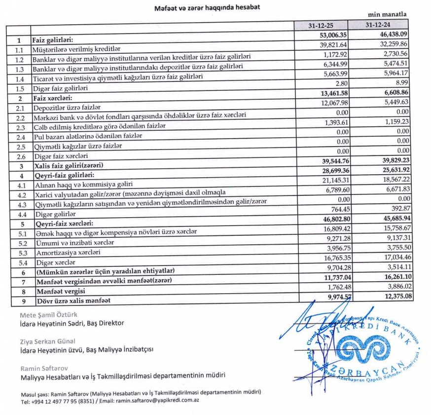 2025-ci ildə “Yapı Kredi Bank Azərbaycan”ın əməliyyat gəlirləri, aktivləri və kredit portfeli artmaqda davam edib. Lakin resursların bahalaşması, faiz xərclərinin kəskin yüksəlməsi və kredit riskləri üzrə ehtiyat ayırmalarının artması xalis mənfəətin azalmasına səbəb olub.