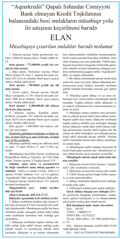 “Aqrarkredit”in balansındakı bəzi əmlaklar satılır - SİYAHI, QİYMƏTLƏR