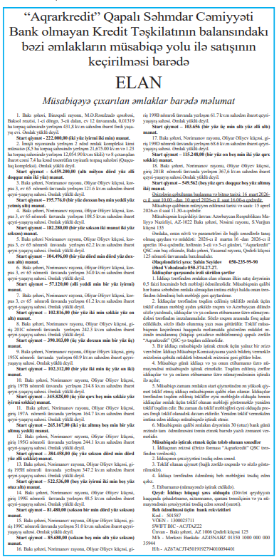 Həmçinin “Aqrarkredit” Qapalı Səhmdar Cəmiyyəti Bank olmayan Kredit Təşkilatının balansındakı aşağıdakı əmlaklar da müsabiqə yolu ilə satılır.