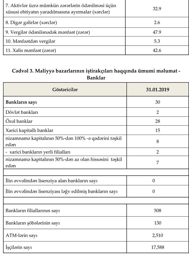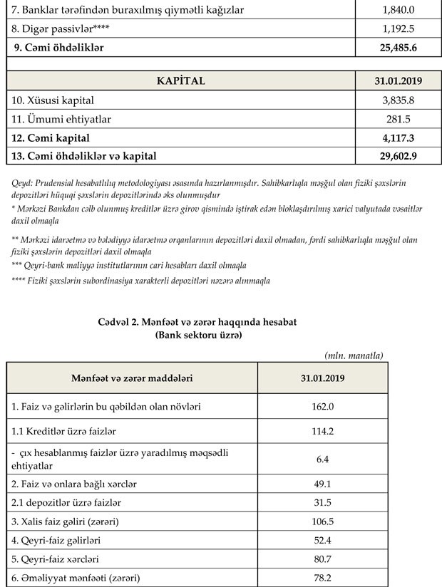 31 yanvar 2019-cu il tarixinə bank sektorunun əsas göstəriciləri bank sektorunun icmal göstəricilərində öz əksini tapıb.