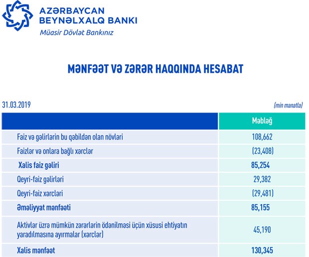 “Azərbaycan Beynəlxalq Bankı” ASC 2019-cu ilin 1-ci rübünü 130 milyon 345 min manat xalis mənfəət ilə başa vurub. Halbuki, Bank ötən ilin eyni dövründə 139 milyon 895 min manat xalis mənfəət əldə etmişdi.