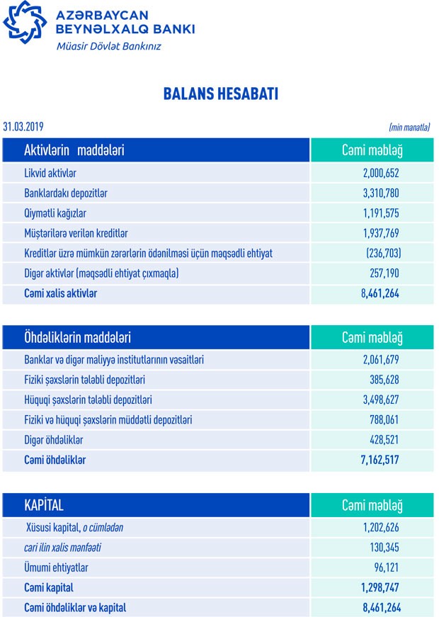 31 Mart 2019-cu il tarixində “Azərbaycan Beynəlxalq Bankı” ASC 8 milyard 461 milyon manat cəmi ativlərə, 7 milyard 163 milyon manat cəmi öhdəliklərə və 1 milyard 298 min manat cəmi aktivlərə malik olub.