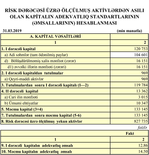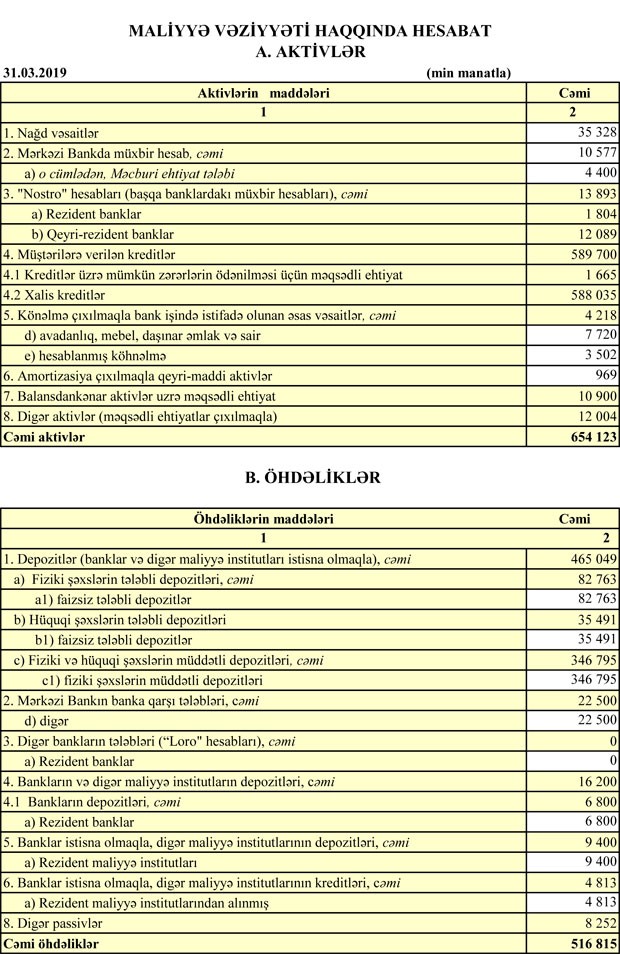 31 Mart 2019-cu il tarixində "Premium Bank" 654 milyon 123 min manat cəmi aktivlərə, 516 milyon 815 min manat cəmi öhdəliklərə və 137 milyon 309 min manat cəmi balans kapitalına malik olub.