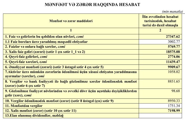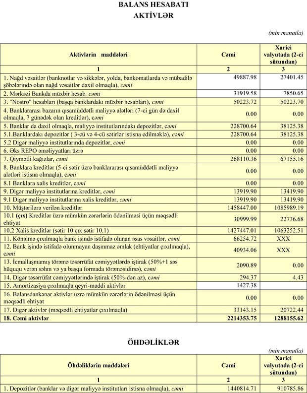 Azərbaycanın daha bir böyük bankı maliyyə vəziyyətini açıqladı