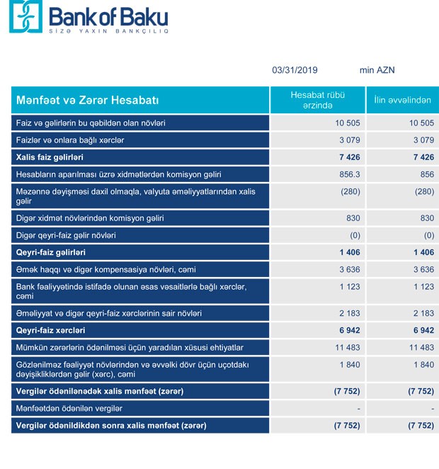 “Marja” Bankın maliyyə göstəricilərinə istinadən xəbər verir ki, 2019-cu ilin yanvar – mart dövründə “Bank of Baku”nun cəmi gəlirləri 13 milyon 751 min manat, cəmi xərcləri isə 21 milyon 504 min manat təşkil edib (xərclərin 11 milyon 483 min manatı mümkün zərərlərin ödənilməsi üçün yaradılan xüsusi ehtiyatlara ayırmadır). Xərclər gəlirləri üstələdiyindən Bank ilk rübü 7 milyon 752 min manat zərər ilə başa vurub.