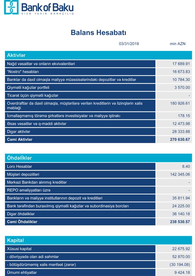 31 Mart 2019-cu il tarixində “Bank of Baku” 270 milyon 630 min manat cəmi aktivlərə, o cümlədən 180 milyon 926 min manat kredit portfelinə malik olub. Ötən ilin sonunda Bank 300 milyon 71 min manat cəmi aktivlərə, 200 milyon 403 min manat kredit portfelinə malik idi.
