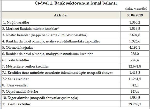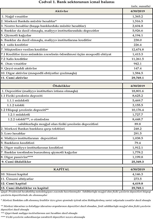 30 aprel 2019-cu il tarixinə Azərbaycanda fəaliyyət göstərən bankların cəmi aktivləri 29 milyard 769.1 milyon manat, cəmi öhdəlikləri isə 25 milyard 349.3 milyon manat təşkil edib. Sektorun balans kapitalı 4 milyard 419.8 milyon manat olub.