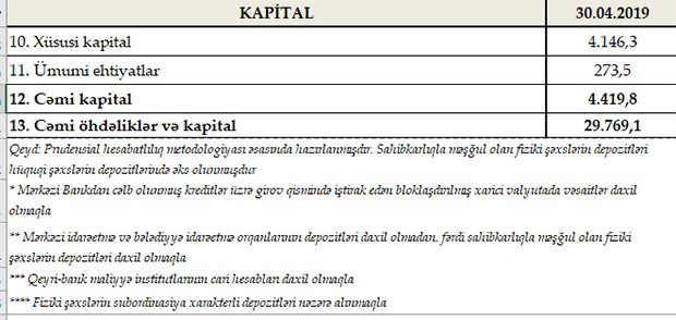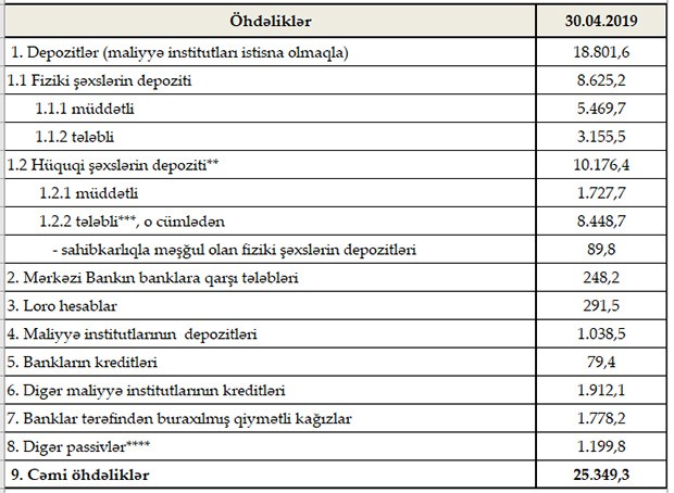 Müqayisə üçün qeyd edək ki, 31 mart 2019-cu il tarixinə Azərbaycanda fəaliyyət göstərən bankların cəmi aktivləri 29 milyard 846.9 milyon manat, cəmi öhdəlikləri 25 milyard 533.2 milyon manat təşkil etmişdi. Sektorun balans kapitalı 4 milyard 313.7 milyon manat olmuşdu.