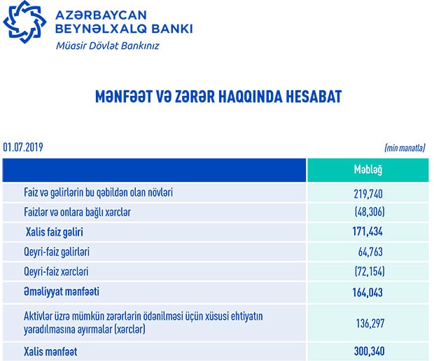 Beləliklə, “Azərbaycan Beynəlxalq Bankı” ASC (ABB) 2019-cu ilin 1-ci yarısını (yanvar-iyun dövrünü) 300 milyon 340 min manat xalis mənfəətlə başa vurub. Bankın xalis mənfəəti 2018-ci ilin 1-ci yarısı ilə müqayisədə 70 milyon 548 min manat və ya 30,7% çoxdur.