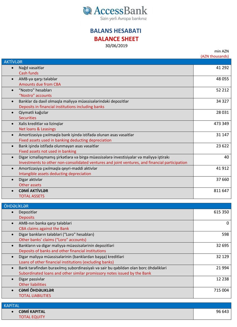 “Marja” Bankın rüblük hesabatına istinadən xəbər verir ki, 30 iyun 2019-cu il tarixində “AccessBank” 811 milyon 647 min manat cəmi aktivlərə malik olub. Aktivlərin 473 milyon 349 min manatını müştərilərə verilmiş xalis kreditlər təşkil edib. 31 Dekabr 2018-ci il tarixində “AccessBank” 878 milyon 688 min manat cəmi aktivlərə və 542 milyon 488 min manat müştərilərə verilmiş xalis kreditlərə malik idi.