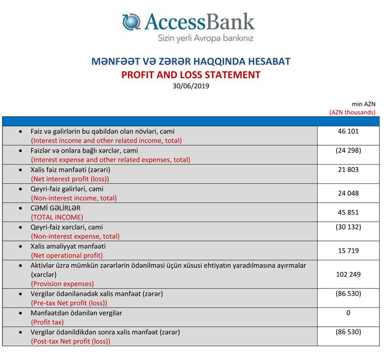 2019-cu ilin yanvar-iyun dövründə “AccessBank”ın cəmi gəlirləri 70 milyon 149 min manat (46 milyon 101 min manatı faiz və 24 milyon 48 min manatı qeyri-faiz), cəmi xərcləri isə 54 milyon 430 min manat (24 milyon 298 min manatı faiz və 30 milyon 132 min manatı qeyri-faiz xərcləri) təşkil edib. Nəticədə Bank 15 milyon 719 min manat əməliyyat mənfəəti əldə edib.