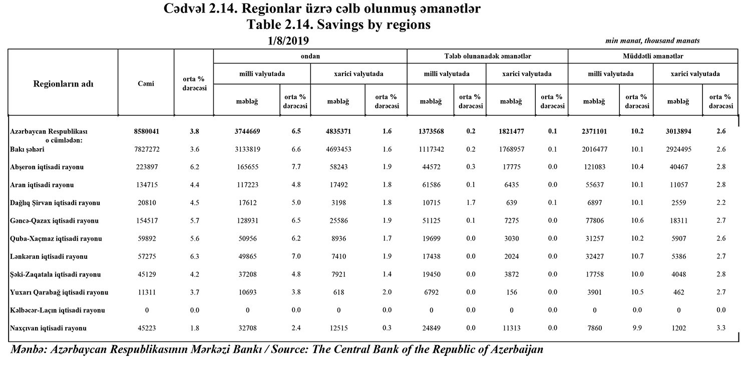 Əmanətlərin 94%-i və ya 8 milyard 51 milyon manatı Bakı şəhəri və Abşeron iqtisadi rayonundan cəlb edilib. Digər regionlardan cəmi 529 milyon manat əmanət cəlb edilib.
