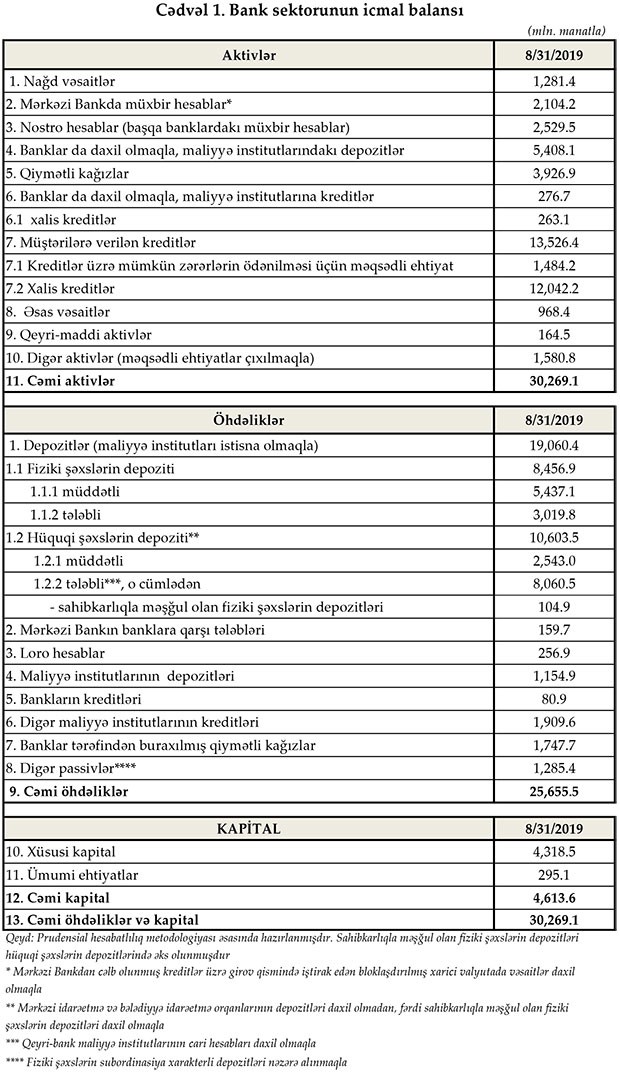 Aktivlərin əsas hissəsini təşkil edən müştərilərə verilən kreditlər 13 milyard 526 milyon 400 min manata çatıb. Müştərilərə verilən kreditlər 2018-ci ilin sonu ilə müqayisədə 898,1 milyon manat, İyul ayının sonu ilə müqayisədə Avqustda isə 184,1 milyon manat artıb.