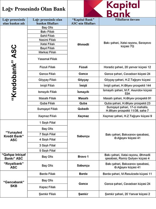 Ləğv prosesində olan banklarda kreditor tələbi olan fiziki şəxslərdən “Kapitalbank” ASC-nin aşağıda təqdim olunan siyahı üzrə filiallarına şəxsiyyətlərini təsdiq edən sənədlə müraciət olunması xahiş olunur.