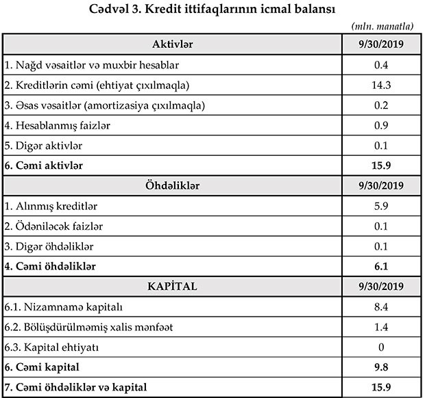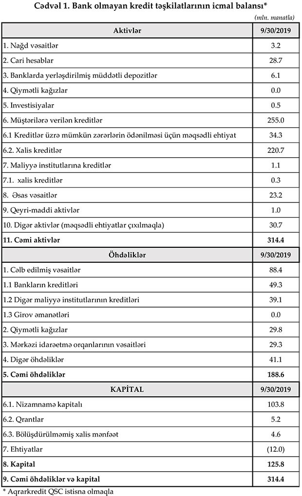 Maliyyə Bazarlarına Nəzaər Platasının yaydığı press-relizə görə, 30 sentyabr 2019-cu il tarixinə Azərbaycanda fəaliyyət göstərən bank olmayan kredit təşkilatlarının (BOKT) cəmi aktivləri 314,4 mln. manat, cəmi öhdəlikləri isə 188,6 mln. manat təşkil edib. Bundan əlavə Kredit ittifaqlarının (Kİ) 2019-cu ilin III rübündə cəmi aktivləri 15,9 mln. manat, cəmi öhdəlikləri isə 6,1 mln. manat təşkil edib.