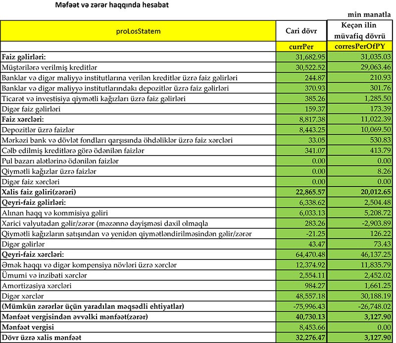 Müqayisə üçün qeyd edək ki, 2018-ci ilin 9 ayında “Bank of Baku”nun cəmi gəlirləri 33 milyon 539 min manat, cəmi xərcləri 57 milyon 159 min manat, əməliyyat zərəri 23 milyon 620 min manat təşkil etmişdi. Ehtiyatın 26 milyon 748 milyon manatının azad olması hesabına zərər bağlanmışdı və bankın 3 milyon 128 min manat xalis mənfəəti yaranmışdı.