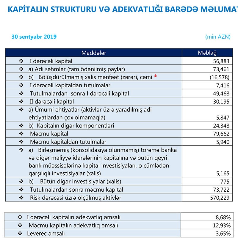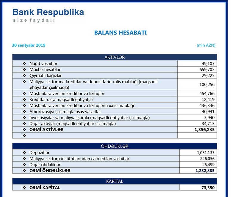 Ötən ilin sonunda 56 milyon 767 min manat təşkil etmiş cəmi balans kapitalı 30 Sentyabr 2019-cu il tarixində 73 milyon 350 min manata çatıb. “Bank Respublika”nın məcmu kapitalı isə 73 milyon 722 min manat təşkil edib.