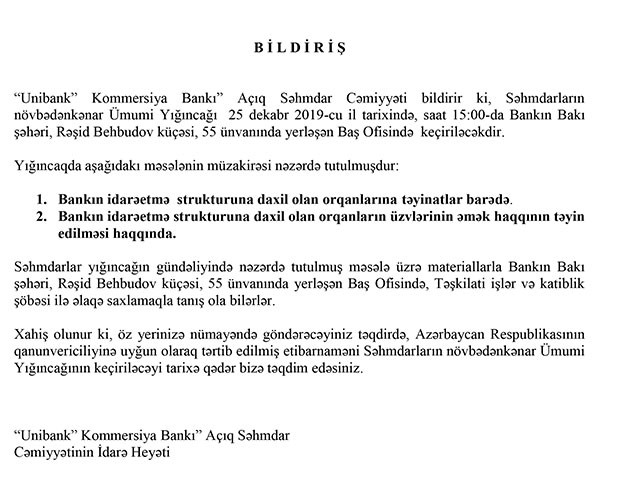 25 Dekabr 2019-cu il tarixində “Unibank Kommersiya Bankı” ASC səhmdarlarının növbədənkənar Ümumi Yığıncağı keçiriləcək.