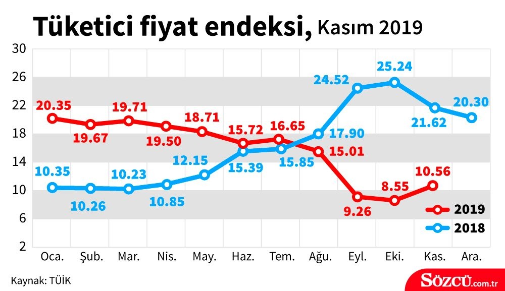 Türkiyədə istehlakçı qiymətləri indeksi (inflyasiya) Noyabrda illik müqayisədə 8.55%-dən 10.56%-ə yüksəlib, aylıq müqayisədə isə 0.38% artıb.