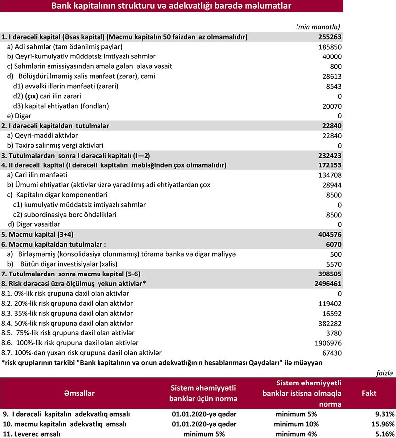 2018-ci ilin sonu ilə müqayisədə “Kapital Bank”ın cəmi aktivləri 11,4% artaraq 2019-cu ilin sonunda 4 milyard 143 milyon 322 min manata, müştərilərə verilən kreditlər 21,3% artaraq 1 milyard 821 milyon 222 min manata, depozitlər isə 9,7% artaraq 3 milyard 235 milyon 996 min manata çatıb.