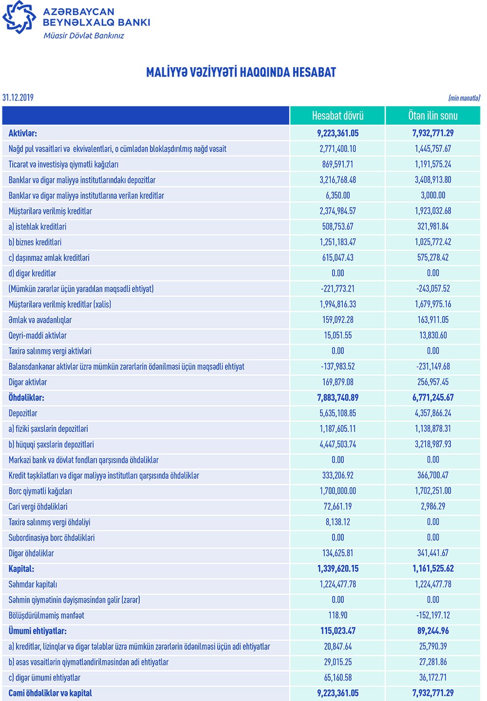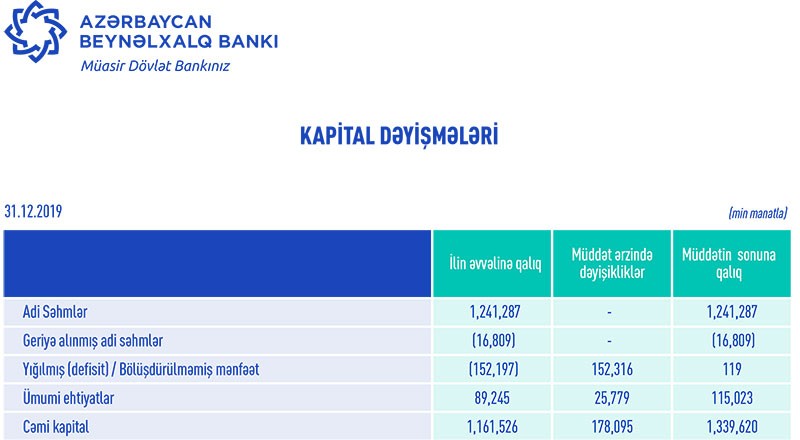 31 Dekabr 2019-cu il tarixində Beynəlxalq Bank 1 milyard 130 milyon 755 min manat məcmu kapitala malik olub.