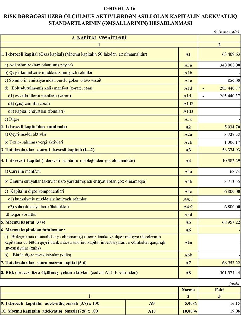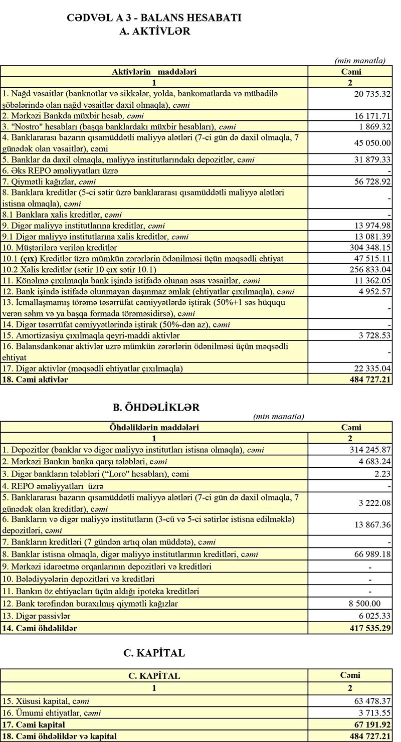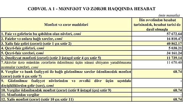 Müqayisə üçün qeyd edək ki, “Yelo Bank” 2018-ci ildə ildə 36 milyon 955 min manat əməliyyat mənfəəti əldə etməsilə bərabər, Aktivlər üzrə mümkün zərərlərin ödənilməsi üçün xüsusi ehtiyatın yaradılmasına 172 milyon 156 min manatın ayırdığından 135 milyon 200 min manat zərərə düşmüşdü.