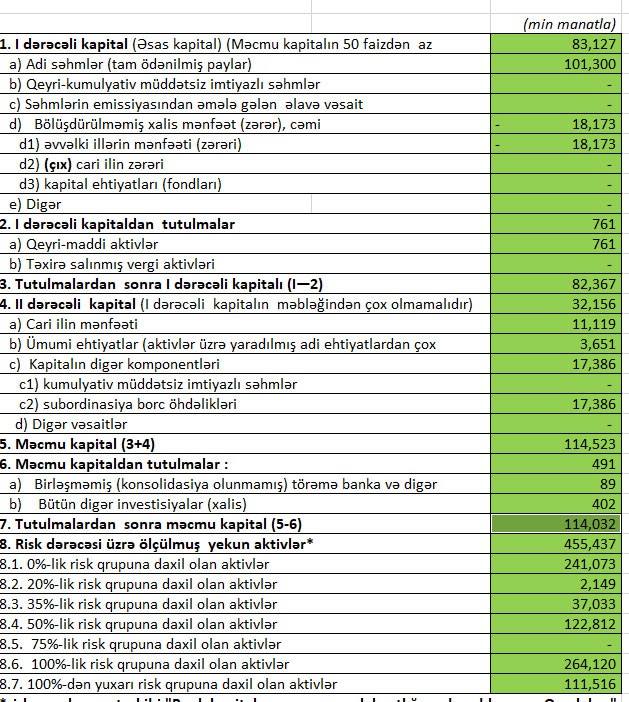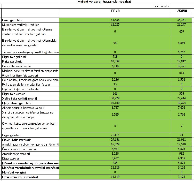 Müqayisə üçün qeyd edək ki, 2018-ci ildə “Rabitəbank”ın əməliyyat mənfəəti 8 milyon 697 min manat təşkil etmiş, əməliyyat mənfəətinin 5 milyon 574 min manatı mümkün zərərlər üçün yaradılan məqsədli ehtiyatlara ayrıldığından 3 milyon 124 min manat xalis mənfəət qalmışdı.