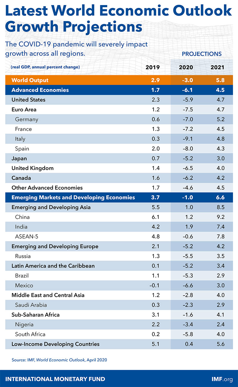 2020-ci il üzrə inkişaf etmiş ölkə iqtisadiyyatları üçün proqnoz mənfi 6.1%-ə endirilib, ABŞ iqtisadiyyatı üzrə proqnoz 2%-dən mənfi 5.9%-ə, Avro Bölgəsi proqnozu 1.3%-dən mənfi 7.5%-ə endirilib.