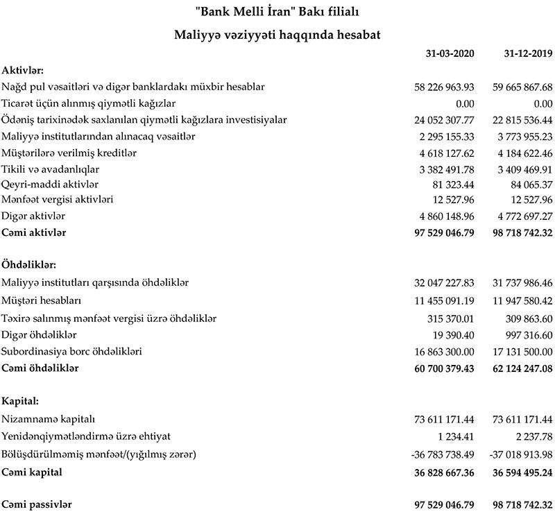 Xatırladaq ki, "Bank Melli İran" Bakı filialı 2019-cu ili 16 milyon 556 min manat zərər ilə başa vurmuşdu. Zərərin səbəbi ehtiyata ehtimal olunan depozit və kredit itkiləri üçün ehtiyata 18 milyon 293 min manat ayrılması idi.