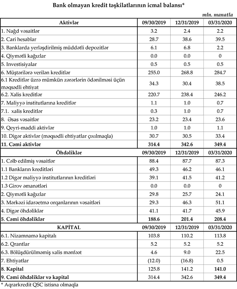 Bu il aprelin 1-nə BOKT-ların aktivləri 349,4 milyon manat olub ki, bunun da 246,2 milyon manatı müştərilərə verilmiş xalis kreditlərdir. Martın sonuna BOKT-lar 208,4 milyon manat öhdəliklərə, 141 milyon manat balans kapitalına malik olub.