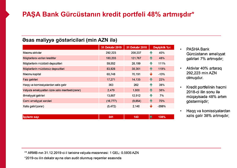 Eyni zamanda, 2018-ci illə müqayisədə 2019-cu ildə PAŞA Bank qrupunun cəmi faiz xərcləri 2 milyon 986 min manat və ya 5,5% artaraq 57 milyon 658 min manat, qeyri-faiz xərcləri isə 14 milyon 737 min manat və ya 12,8% artaraq 129 milyon 619 min manat təşkil edib. Qrupun cəmi faiz və qeyri-faiz xərcləri 17 milyon 723 min manat artıb.
