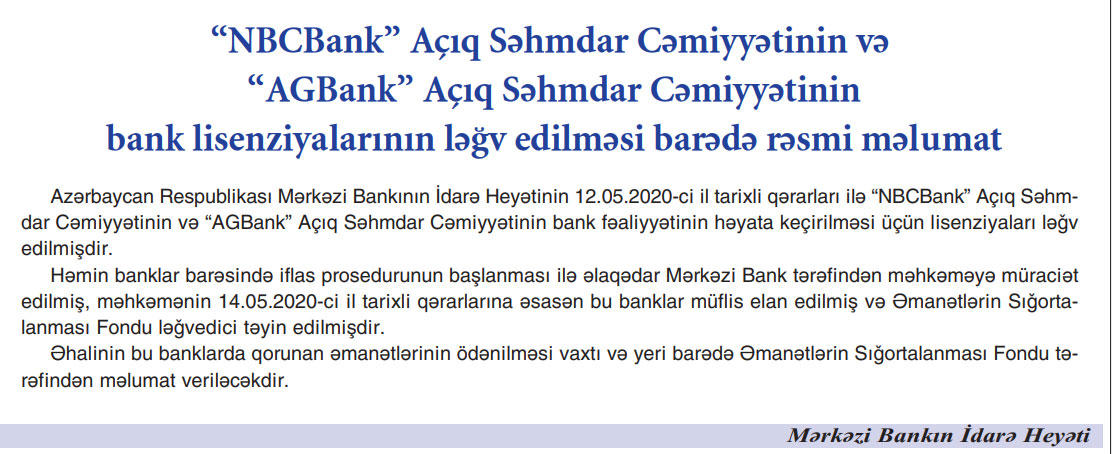 Lisenziyaları ləğv edilmiş AGBank və NBC Bank məhkəmənin 14.05.2020-ci il tarixili qərarı ilə müflis elan edilmiş və Əmanətlərin Sığortalanması Fondu ləğvedici təyin edilib.