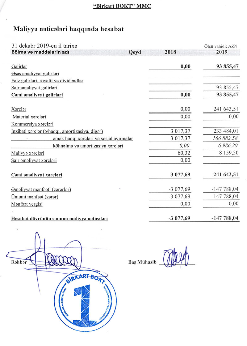 Marja hesabatlara istinadən xəbər verir ki, “Birkart BOKT” 2018-ci ildə fəaliyyətə başlasa da 2019-cu ildən aktiv fəaliyyətə başlayıb - müştərilərə kreditlər verilib, gəlirlər əldə edilib.