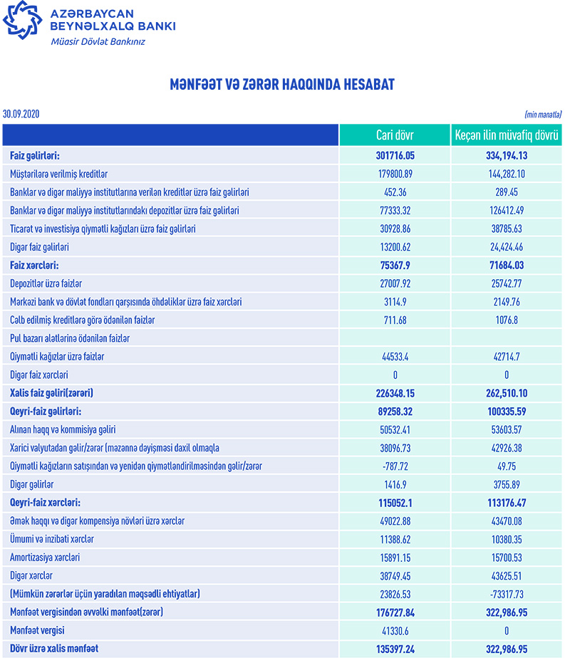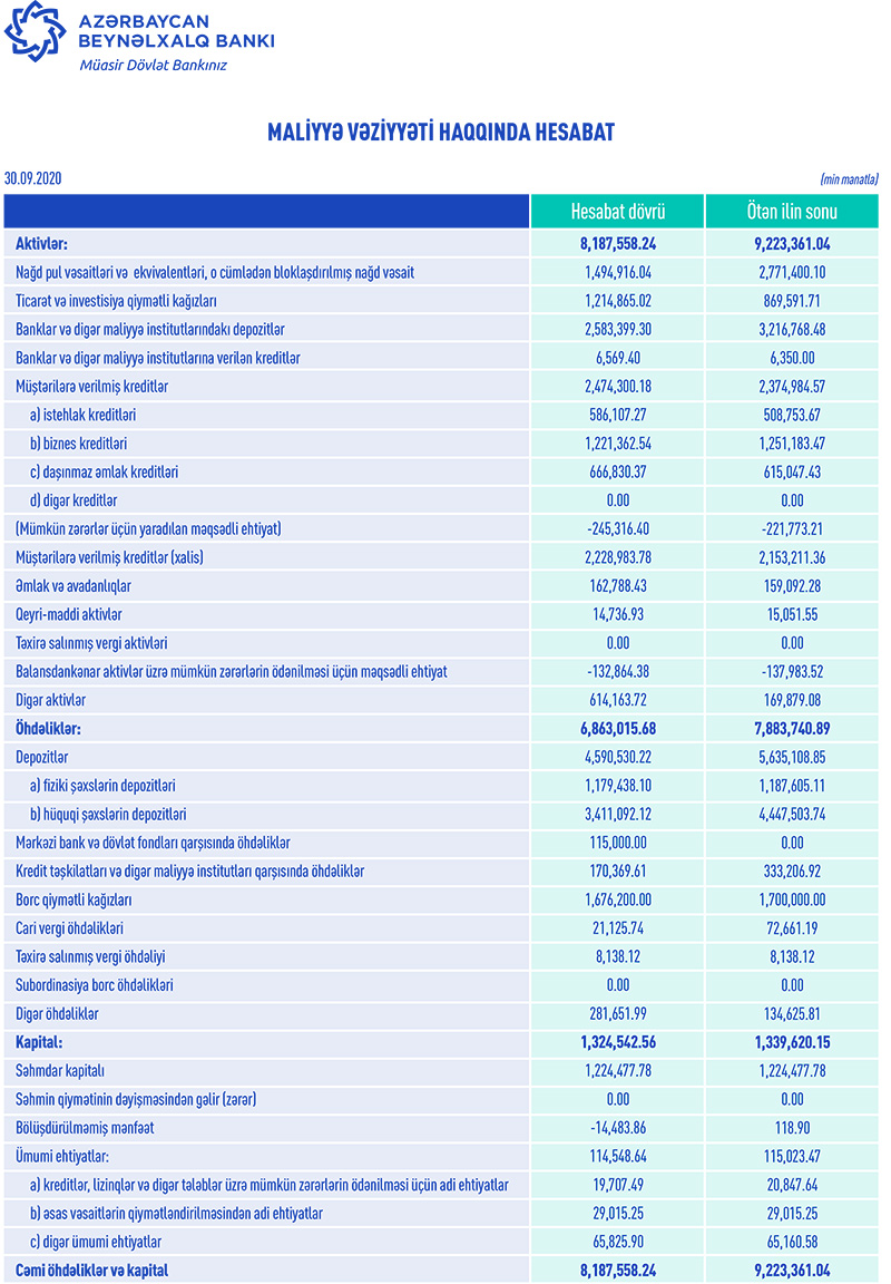 Azərbaycanın ən böyük bankı olan “Azərbaycan Beynəlxalq Bankı” ASC 2020-ci ilin 9 ayı (yanvar-sentyabr) üzrə maliyyə göstəricilərini açıqlayıb.