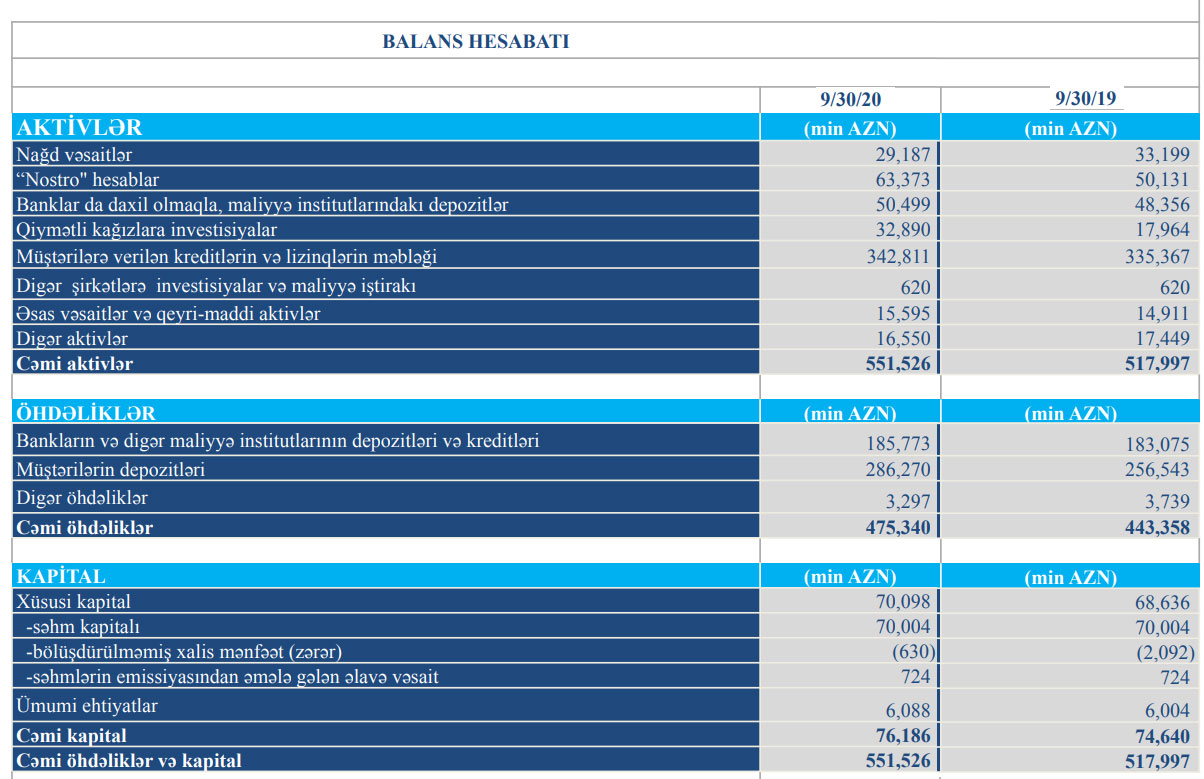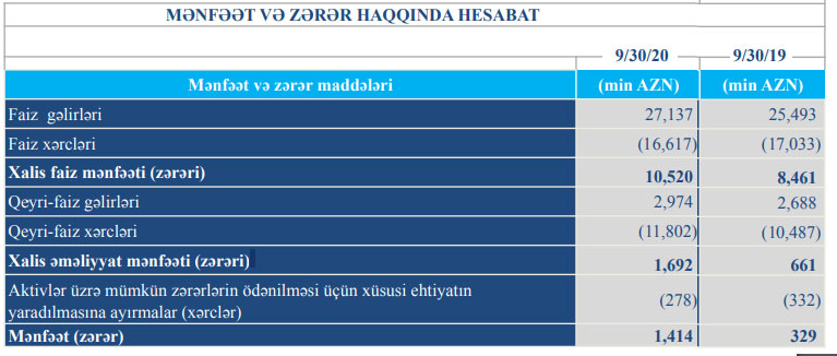 Müqayisə üçün qeyd edək ki, 2019-cu ilin 9 ayında Turanbankın cəmi əməliyyat gəlirləri 28 milyon 181 min manat, cəmi əməliyyat xərcləri 27 milyon 520 min manat, əməliyyat mənfəəti 661 min manat təşkil etmişdi. Bank əməliyyat mənfəətinin 332 min manatını aktivlər üzrə mümkün zərərlərin ödənilməsi üçün xüsusi ehtiyatın yaradılmasına ayırmışdı.