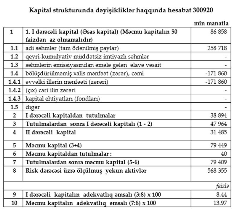 Hazırda Bankın cəmi balans kapitalı 96.3 milyon manat təşkil edir ki, bu da minimum məcmu kapital normasından (50 milyon manat) demək olar ki, iki dəfə artıqdır.