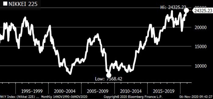 Sərmayəçilər, ABŞ-dan gələcək seçki nəticələrini gözləyərkən, Yaponiyanın Nikkei indeksi 1991-ci ildən bu yana ən yüksək səviyyəsində bağlanıb.