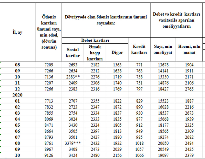 2020-ci ilin 10 ayı ərzində sosial kartların sayı 1 milyon 41 min ədəd, əməkhaqqı kartlarının sayı 164 min ədəd, digər debet kartlarının sayı 387 min ədəd, kredit kartlarının sayı isə 269 min ədəd artıb.