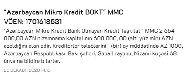 Məlumata görə, kreditorlar 1 ay ərzində tələblərini Bakı şəhəri, Səbail rayonu, Nizami küçəsi, 68 ünvanına bildirə bilərlər.